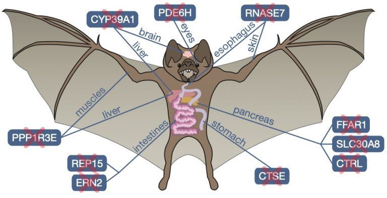 Our previous work discovered that two frugivorous bats lost genes that – when inactivated — enhance insulin secretion (FFAR3) and insulin sensitivity (FAM3B) [1]. Using our Forward Genomics framework we searched for genes preferentially lost in herbivorous and in carnivorous mammals [2]. For herbivores, our screen uncovered convergent losses of the lipase inhibitor PNLIPRP1, which enhances fat digestion, and repeated losses of the pancreatic exocytosis factor SYCN, which relates to continuous zymogen secretion. For carnivores, we found losses of genes regulating appetite and glucose homeostasis (INSL5, RXFP4) and losses of xenobiotic receptors (NR1I3, NR1I2) that reflecting irregular feeding patterns and a reduced xenobiotic content [2]. By generating a haplotype-resolved chromosome-level assembly of the common vampire bat, we discovered previously-unknown gene losses that relate to metabolic and physiological changes, including losses that likely contributed to enhanced iron excretion (CYP39A1) and the exceptional social behavior of vampire bats (REP15) [3]. We also discovered that hummingbirds lost a key enzyme, which facilitated metabolic muscle adaptations required for the evolution of hovering flight [4].