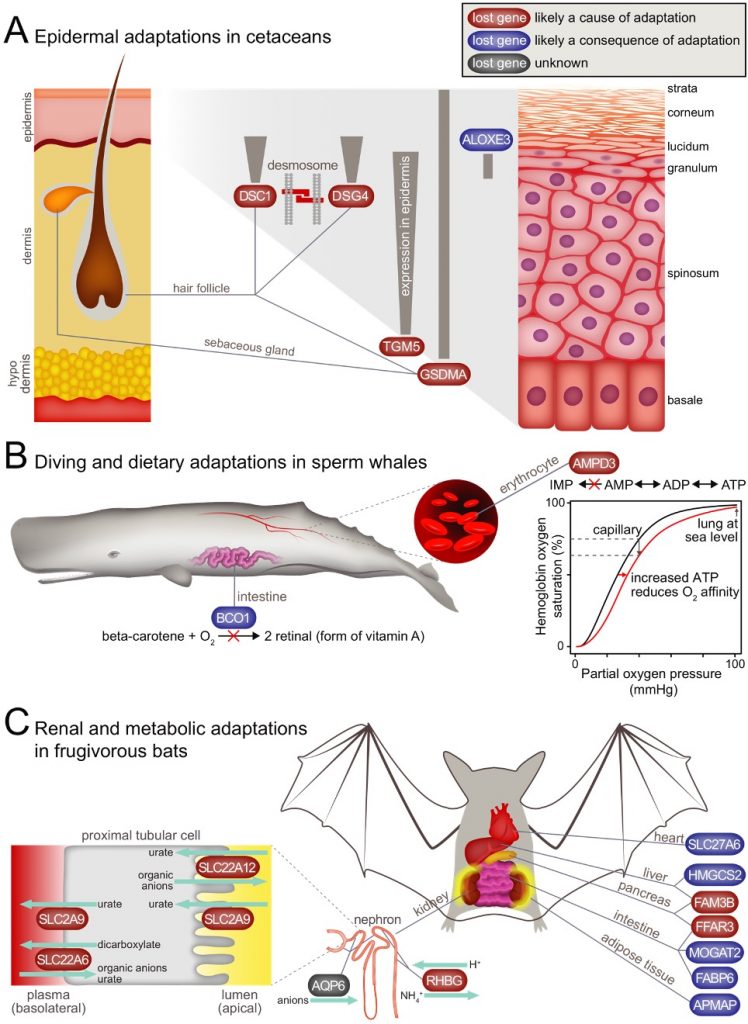 These results suggest that gene loss in mammals as an evolutionary mechanism for adaptation may be more widespread than previously thought. We continue to search for adaptive gene losses in mammals, birds and other organisms.