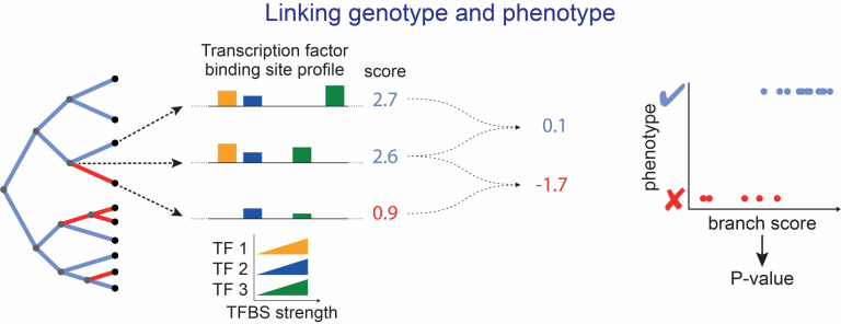 We have improved the original prototype method by taking species relatedness and differences in evolutionary rates into account and computing P-values for phenotype-genotype associations [2]. To improve the power to detect relevant changes in cis-regulatory elements, we developed “Regulatory Element forward genomics” (REforge) and “Transcription factor forward genomics” (TFforge) that measure transcription factor binding site divergence across a phylogeny and detect both regulatory elements and regulators (TFs) that are associated with a given phenotype [3,4]. We also developed Forward Genomics methods that specifically associate gene losses with phenotypes [5].